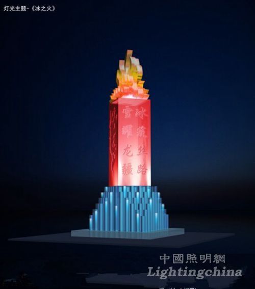 勇电照明提交的《冰之火》作品,冰雕造型下部分是高高低低不同的光柱,如同音符跳动,中间部分“冰筑丝路,雪耀龙疆”的打字雕刻在上面,用灯光打亮特别醒目,主体的上方是火焰的造型,祝贺哈尔滨冰雪节举办红红火火,也如同接力祝贺17届接力18届。